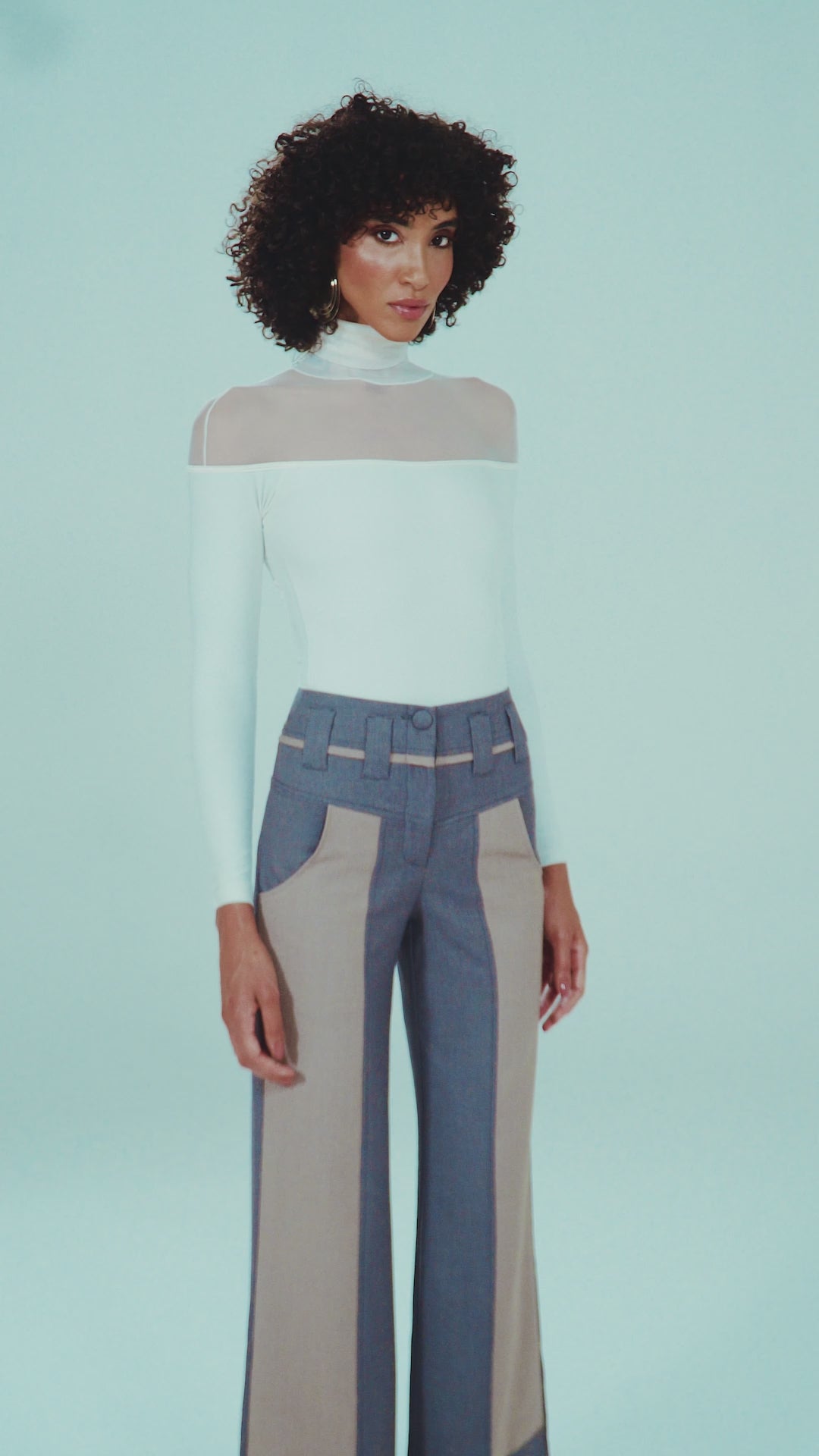 Body manga comprida, confeccionado em tule. Gola alta drapeada. Decote ombro a ombro feito em tule. Costas com recorte em "U". Bumbum retrô. Fechamento do fundilho.