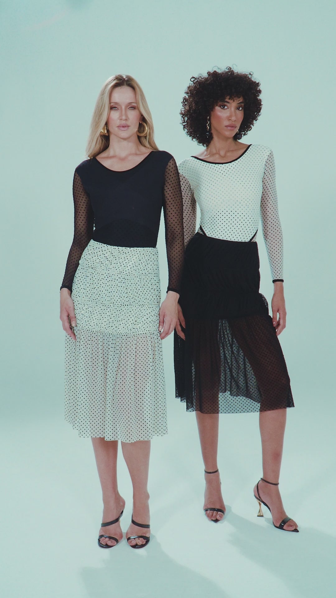 Body manga comprida, confeccionado com tule de poá. Decote em "U". Faixas de tule sobrepostos. Debrum de veludo nos punhos e nos recortes. Bumbum retrô. Fechamento no fundilho.